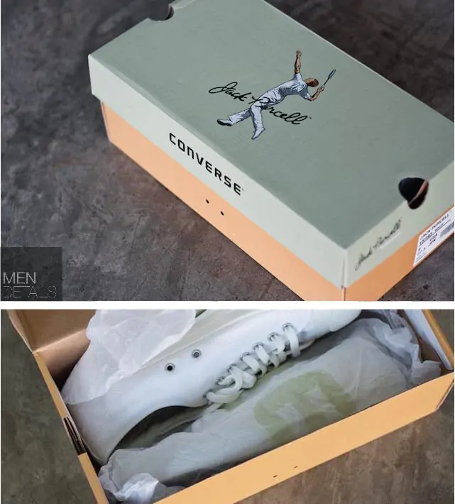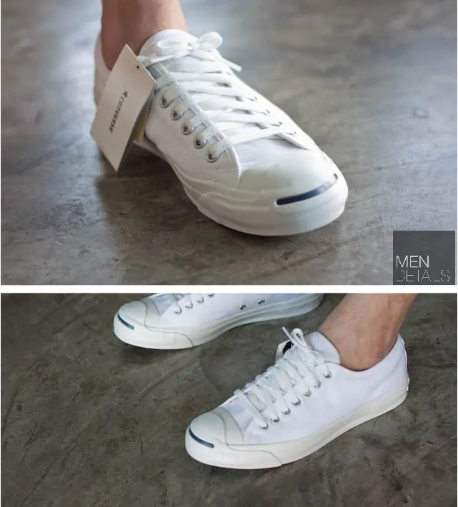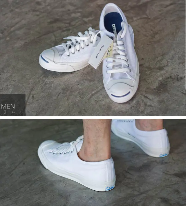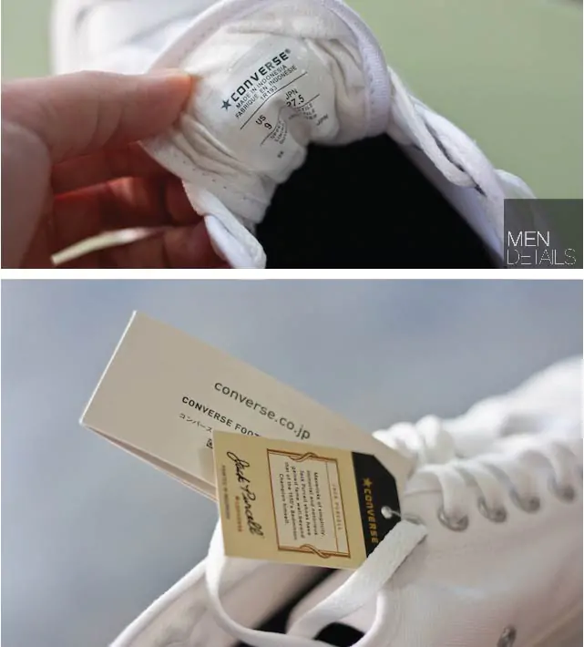 รุ่นนี้เป็นรุ่น Limited JPN ซึ่งผลิตในประเทศอินโดนีเซีย แต่มาตราฐานญี่ปุ่นนะครับ ใครๆ ก็รู้ว่าจะขายของให้ญี่ปุ่นให้รับจ้างผลิตจากญี่ปุ่นมันหนักหนาแค่ไหน เริ่มต้นที่กล่องเลย กล่องจะคล้ายๆ แนว Vintage ที่ United Arrow Green Label Relaxing เคยทำ คราวนี้ Converse Japan ขอทำบ้างละกัน ต่อมาก็เป็นยิ้มครับ ผลิตออกมาเป็นแบบดั้งเดิม คือไม่ใช้ยางแปะเหมือนรุ่นที่ขายในบ้านเรา แต่จะทำเป็นร่องลึกเข้าไปและยางจะหุ้มสูงกว่ารุ่นปกติเช่นกัน ส่วนที่สำคัญอีกอันก็คือ “หนวดของ Jack” ครับที่ทำเลียนแบบรุ่นโบราณ (ป้ายแปะบริเวณส้นเท้า)